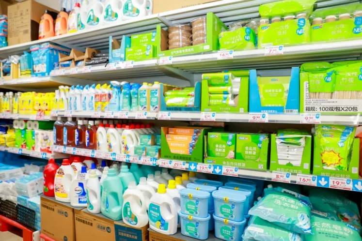 从上游工厂到门店,NB采用极简商业模式,主张去中间化,将不必要的环节、不必要的人力、不必要的装修和包装设计,统统砍掉,以效率和成本为先。所以,顾客可以看到门店整箱上架的零食、整筐上架的水果蔬菜,还有走“极简风”的门店装修和商品包装,旨在全链路为用户省钱。